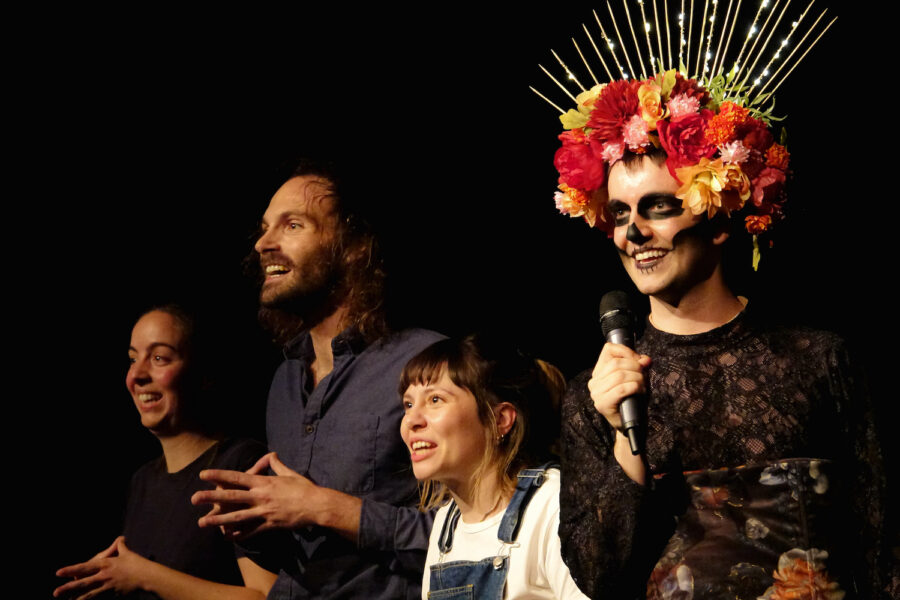 Déambulant autour du trio, une drôle de créature extradiégétique : Calavera. Entre l’égérie queer et la camarde de festival (on pense à la fête des morts au Mexique), elle est une faucheuse sympathique et cynique qui philosophe avec humour sur la situation. Dans le rôle, Simon Quintana est bluffant.